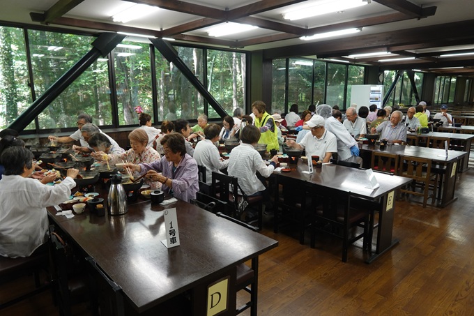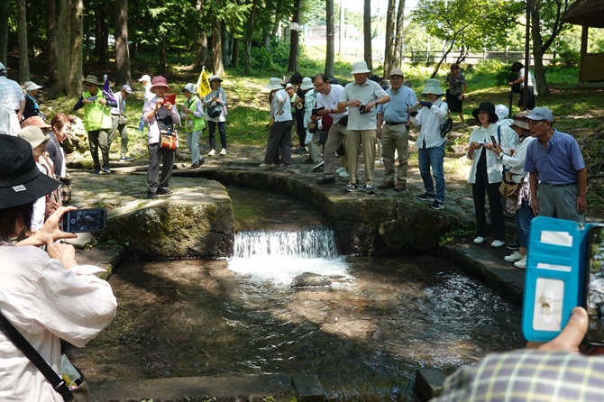 直前3名の欠席者があり57名の参加。8時出発、双葉SAで休息、「三分一湧水」に10時40分到着。緑に囲まれ綺麗な湧水が流れる道は 心癒される。水は非常に冷たかった。新鮮な野菜や土産物がある「道の駅こぶちざわ」で買い物。皆さんトマトや珍しい紫色トウモロコシなど色々買われていた。 「八ヶ岳チーズケーキ工房」で昼食、店内は冷房が効いていて暑いなかでの「ほうとう鍋」おいしく頂いた。「サントリー白洲蒸留所」の白洲の森を歩きサントリー ミュージアムを見学、ミュージアム内はサントリーの製品が並んだ陳列棚や、ウィスキーの樽、サントリーの歴史の紹介などが展示されていた。 セントラルハウスでは、店頭ではなかなか手に入らないウィスキーの「白洲」が一人1本限定で販売されていてかなりの方が購入されていた。 店内には有料で試飲できるコーナーもあり試飲されている方もいた。車窓からは雪の無い富士山、八ヶ岳連峰が望まれたが、甲斐駒は見えなかった。 高原のイメージで涼しいと予想していたが、残念ながら高原の涼しさは味わえなかった。帰途は一部渋滞があったがおおむね順調に進み6時には府中に到着。