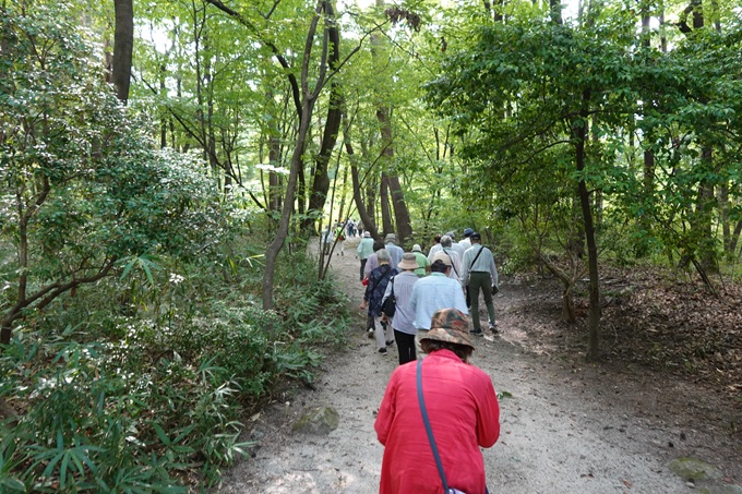 4日間猛暑日から解放されていたのが、今日は再び猛暑日の中の例会。やはり予想通り参加者は少な目の38名で 京王線沿線の「多摩動物公園駅」前に集合し出発。「多摩モノレール」の高架橋沿いを歩き、「七生丘陵散策コース」の 山道へ。道幅は狭いが舗装され、右手が切り開かれ、栗林が有り、新道ができる前の山道を歩き大通りへ出るところで 水分補給の休憩。塀で囲われた「旧多摩テック」沿いの坂道を登り切ったところからちょっと分かりにくい脇道に入り「堀之内寺沢 里山公園の塀に沿た雑木林に囲われた山道を、ジブリの「平成ぽんぽこ狸合戦」の狸の会合場所のモデルとなったと言われている 「阿弥蛇堂」へ。「阿弥陀堂」に隣接する「堀之内寺沢里山公園管理事務所」前で昼食。事務所脇に地区のボランティアで管理された 綺麗なWCや自動販売機があり、皆さん日差しを避け日影で食事されていた。 「京王堀之内駅」近くの「南八幡神社」で解散式、誰も熱中症にもならず無事例会を終えた。