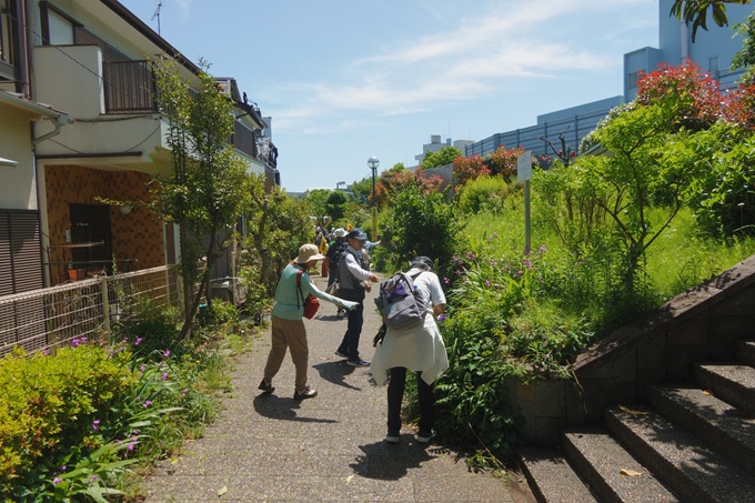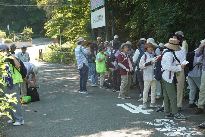 聖蹟桜ヶ丘駅前で出発式、市街地を抜け大栗川に沿って歩き、水分補給を取りながら並木橋を渡りブルベリー畑や道端の木苺の 実を摘んだりと里山の山道を登り柚木農場へ。今は一般の立ち入りができない柚木農場前で一休み。坂道を下り和田公園で休息、大栗川沿いを歩き 並木公園で皆さん木陰で昼食。昼食後、読経を聞きながらボケ防止の宝泉寺を参拝、寺門前から「お化け坂」と言われている急な坂道を下り 再び大栗川沿いを歩き聖蹟桜ヶ丘駅前で解散。気温が29度と暑い中での例会であったが、水分補給と日陰での休息、全員元気で例会を終えることが出来た。