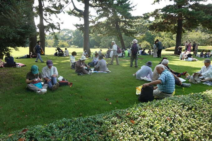 東京駅丸の内口を出るとレンガ造りの「東京駅」の正面に出る。広い「行幸通り」を真直ぐ行き「和田倉噴水公園」で「出発式」。 緑の芝と松に囲まれた「皇居外苑」を歩き「楠木正成像」前へ。皇居外苑側から「桜田門」の1つ目の門をを潜り「内堀通り」に面した門を抜けると 正面に「警視庁」やレンガ造りの「最高裁判所」少し離れて「国会議事堂」が望めた。「桜田門」からきた道を戻るように「皇居外苑」を「大手門」方向に 歩き、「二重橋」を望み、「大手門」脇の広場で参加者の集合写真を撮り、「大手門」から手荷物検査を経て「皇居東御苑」に入る。 「同心番所」や「百人番所」の木造の建物、所々道の両側に江戸城の名残の大きな石垣のある砂利道を歩き、坂道を登り「富士見櫓」へ。 石垣だけが残る「江戸城天守閣跡」の石垣の上からの眺望はビルに囲まれ見通せない。「旧本丸跡」の芝生で昼食。昼食後、都道府県の木が植えられた 「二の丸庭園」を通り「大手門」から「東御苑」を出て「和田倉噴水公園」で解散式。東京駅や皇居外苑、東御苑も外国の方が大勢で 日本の方が少なく感じた。今回は「東御苑」を時間を掛けで周り、会員の方から「こんなに詳しく見たことがなかった、よかった」との声が聞かれた。