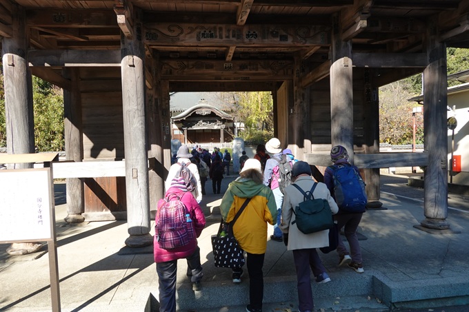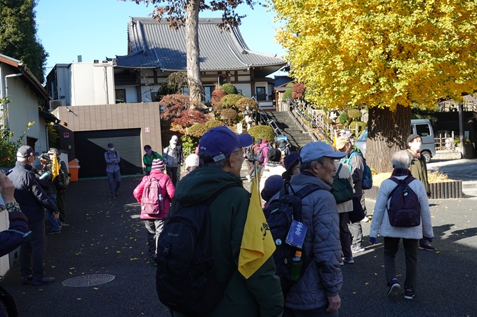 最高気温が10度の天気予報。皆さん寒さ対策でしっかり着込んで集合。ラジオ体操で体を温めて出発。 蛍が見られる小川に沿って「姿見の池」へ。散歩には良い道。紅葉には遅く池面には落葉が浮かんでいた。 イチョウが黄色に色づいた「東福寺」から「武蔵国分寺泉地区」で新たに建てられた「東京都公文書館」で開催されていた 「渋沢栄一」関連の展示を見学、隣の「国分寺市役所」のロビーに展示されている「武蔵国分寺の七重の塔」の模型を見学して 100m程度の「伝鎌倉街道」を歩き「黒鐘公園・武蔵国分寺尼寺跡」で休息。 「武蔵国分寺跡」で昼食、晴れているが少し風があり寒い。 「国分寺」を参拝。すぐそばの「真姿の池湧水群」に向かう道筋に無人の野菜販売所があり、皆さん柿や野菜を 買い求めていた。「真姿の池湧水群」は赤く塗られた手摺の橋の先に小さなお堂があり、赤い紅葉が池面に映り綺麗だった。